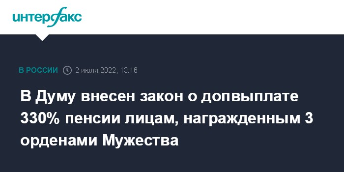 В Думу внесен закон о допвыплате 330% пенсии лицам, награжденным 3 орденами Мужества