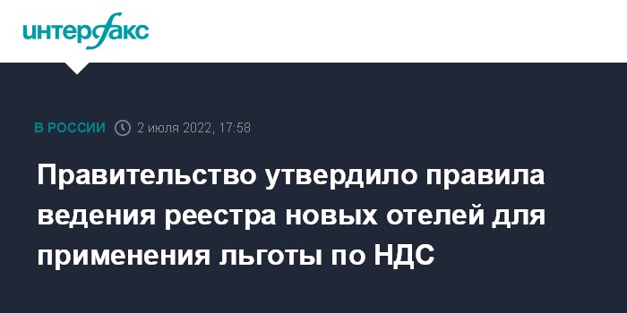 Москва. 2 июля. INTERFAX.RU - Правительство РФ утвердило правила ведения реестра новых отелей и других объектов туриндустрии, владельцы которых будут освобождены от налога на добавленную стоимость (НДС) на ближайшие пять лет, сообщается в субботу на сайте кабинета министров.