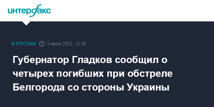 Москва. 3 июля. INTERFAX.RU - Губернатор Белгородской области Вячеслав Гладков сообщил о четырех погибших и четырех раненых при ночном обстреле Белгорода со стороны Украины.