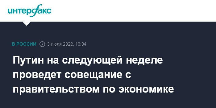 Москва. 3 июля. INTERFAX.RU - Президент РФ Владимир Путин на предстоящей неделе проведет совещание с членами правительства по вопросам экономики и встретится с победителями конкурса управленцев "Лидеры России". График президента на следующую неделю был озвучен в программе "Москва. Кремль. Путин" телеканала "Россия 1" (ВГТРК).