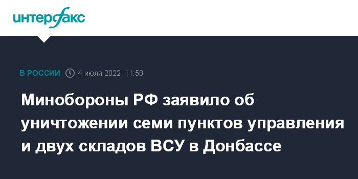 Москва. 4 июля. INTERFAX.RU - Российские военные сообщили об уничтожении за сутки высокоточным оружием семи пунктов управления и двух складов армии Украины в Донбассе.