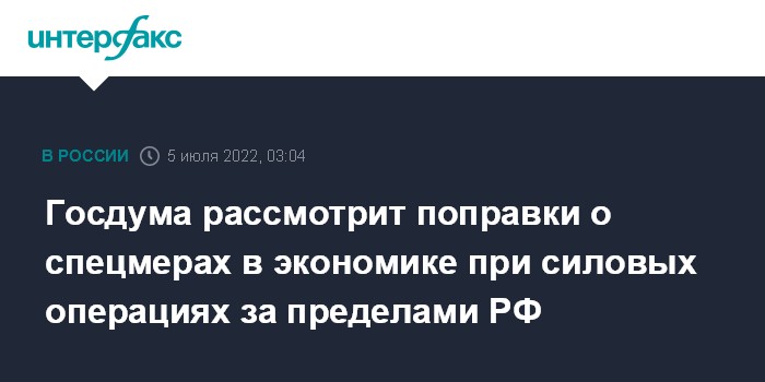Москва. 5 июля. INTERFAX.RU - Госдума во вторник рассмотрит в первом чтении проект закона о праве правительства РФ вводить специальные меры в сфере экономики в целях обеспечения проведения Вооруженными силами РФ, другими войсками, воинскими формированиями и органами контртеррористических и иных операций за пределами территории РФ.