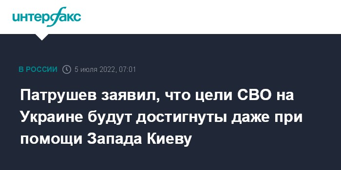 Москва. 5 июля. INTERFAX.RU - Цели российской специальной операции будут достигнуты, несмотря на военную помощь США и Запада Украине и увеличение поставок ей летального оружия, заявил секретарь Совета безопасности РФ Николай Патрушев.