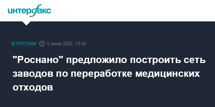 Москва. 5 июля. INTERFAX.RU - "Роснано" предлагает реализовать в РФ проект по безотходному обезвреживанию медицинских, биологических и особо опасных отходов, в рамках которого планируется построить 15 заводов по их переработке, сообщил "Интерфаксу" источник, знакомый с инициативой госкомпании.