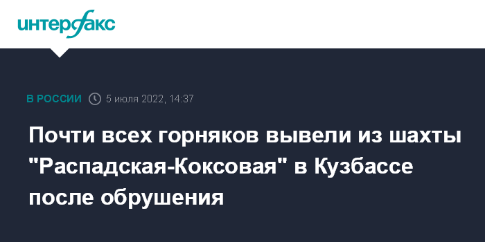 Москва. 5 июля. INTERFAX.RU - Все горняки, кроме двоих пропавших, выведены на поверхность на шахте "Распадская-Коксовая" в Кузбассе, где произошло обрушение, сообщает пресс-служба МЧС РФ.