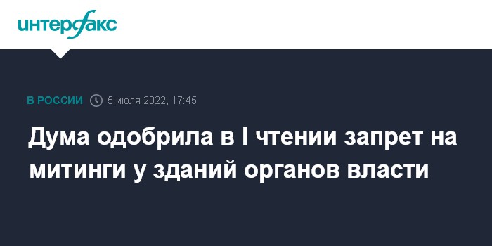 Москва. 5 июля. INTERFAX.RU - Госдума во вторник приняла в первом чтении проект закона, который предусматривает запрет на проведение собраний, митингов, шествий, демонстраций на вокзалах, в школах, в зданиях органов публичной власти.
