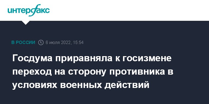 Закон вносит уточнение в статью 275 УК РФ в целях отнесения к государственной измене действий, связанных с переходом на сторону противника в условиях вооруженного конфликта или военных действий против РФ. Таким образом, за подобные действия в случае принятия законопроекта будет грозить до 20 лет лишения свободы.