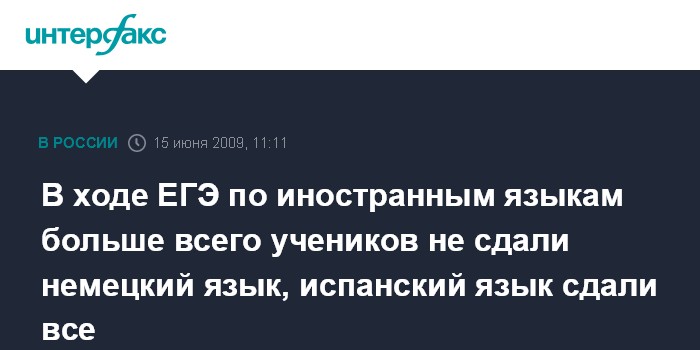 Москва. 15 июня. INTERFAX.RU – В ходе Единого госэкзамена (ЕГЭ) по иностранным языкам худший результат продемонстрировали школьники, сдававшие немецкий язык, - 10,4% не сдавших, сообщает пресс-служба Рособрнадзора.