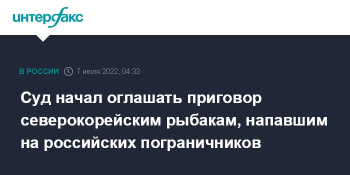 Москва. 7 июля. INTERFAX.RU - Оглашение приговора 14 рыбакам из КНДР, обвиняемым в нападении на российских пограничников в 2019 году в Японском море, началось в четверг в Приморском краевом суде во Владивостоке, передает корреспондент "Интерфакса" из зала суда.