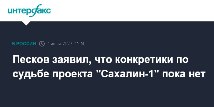 Москва. 7 июля. INTERFAX.RU - В случае с проектом "Сахалин-1" таких же решений, как по "Сахалин-2", пока нет, заявил пресс-секретарь президента РФ Дмитрий Песков.