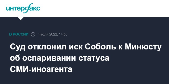Москва. 7 июля. INTERFAX.RU - Замоскворецкий суд Москвы отказал в удовлетворении исковых требований к Минюсту оппозиционерки Любови Соболь, которая оспаривала свое внесение в реестр лиц, выполняющих функцию СМИ-иностранного агента.