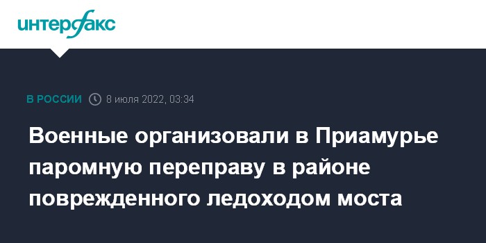 Москва. 8 июля. INTERFAX.RU - Военные инженеры Восточного военного округа (ВВО) запустили в работу паромную переправу на реке Селемджа в Амурской области в районе населенных пунктов, оказавшихся после повреждения моста в транспортной блокаде.