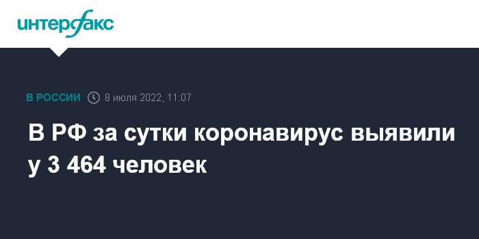 Москва. 8 июля. INTERFAX.RU - Суточный прирост новых заболевших коронавирусной инфекцией в РФ составил 3 464 случая, следует из данных оперативного штаба, обнародованных в пятницу.