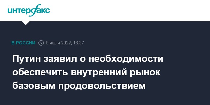 Москва. 8 июля. INTERFAX.RU - Президент РФ Владимир Путин прогнозирует напряженную ситуацию на мировом продовольственном рынке и подчеркивает, что в этих условиях Россия должна, прежде всего, обеспечить внутренний рынок базовыми видами продовольствия.