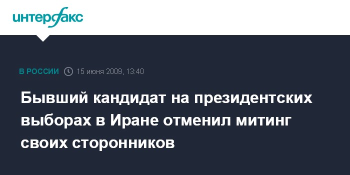 Москва. 15 июня. INTERFAX.RU - Бывший кандидат на 10-х президентских выборах в Иране Мир-Хосейн Мусави принял решение отменить массовый митинг в столице страны на фоне беспорядков, начавшихся в Тегеране после опубликования результатов пятничного голосования, сообщает британская телерадиокорпорация BBC.
