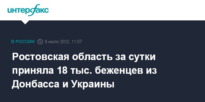 Москва. 9 июля. INTERFAX.RU - Более 18 тыс. беженцев с территорий Донбасса и Украины прибыли в Ростовскую область за прошедшие сутки, сообщает в субботу пресс-служба регионального Погрануправления ФСБ.