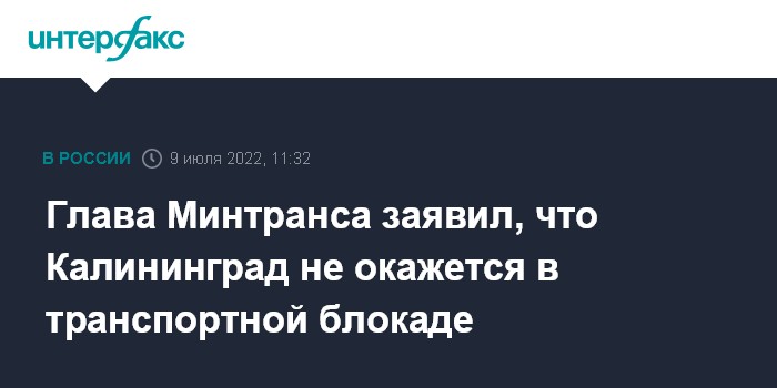 Москва. 9 июля. INTERFAX.RU - Калининградская область не окажется в транспортной блокаде из-за ситуации с ограничениями по транзиту, сообщил министр транспорта РФ Виталий Савельев, выступая на сессии форума "Территория смыслов".