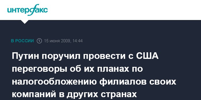 Москва. 15 июня. INTERFAX.RU - Премьер-министр РФ Владимир Путин поручил министерству финансов России провести с США переговоры по поводу планов Соединенных Штатов по налогообложению филиалов своих компаний в других странах.