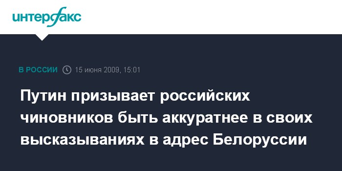 Москва. 15 июня. INTERFAX.RU - Премьер-министр РФ Владимир Путин призвал российских чиновников быть корректными в своих высказываниях в адрес Белоруссии.