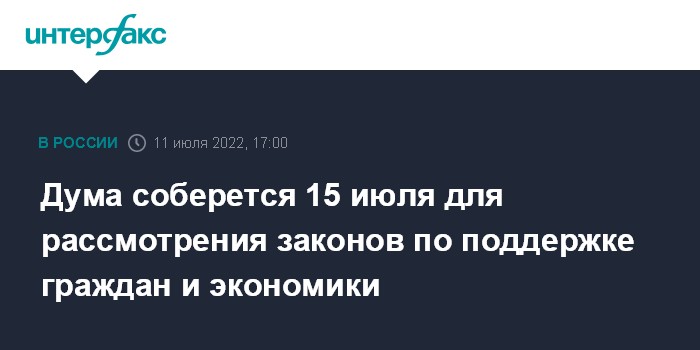 "Совет Государственной думы сегодня принял решение о проведении 15 июля в 12:00 внеочередного пленарного заседания. На нем планируется рассмотреть инициативы правительства и депутатов по поддержке граждан и экономики", - приводит слова Володина пресс-служба Госдумы в понедельник.