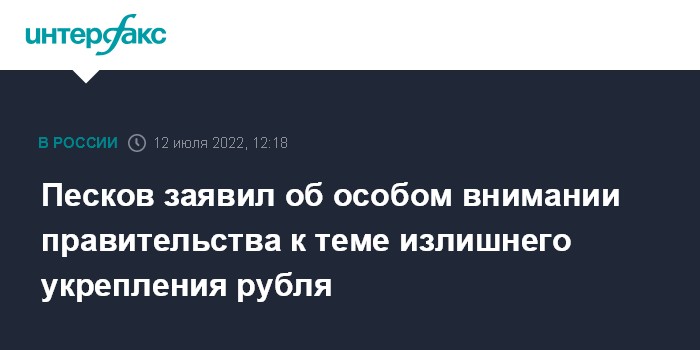 Москва. 12 июля. INTERFAX.RU - Излишнее усиление рубля - это тема особого внимания правительства, которая высоко стоит в повестке дня, заявил пресс-секретарь президента РФ Дмитрий Песков.