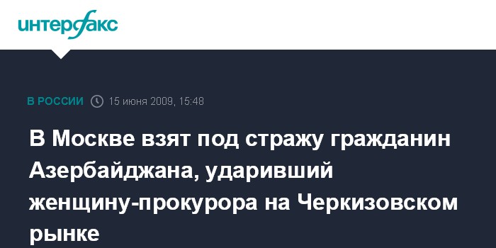 Москва. 15 июня. INTERFAX.RU - Гражданин Азербайджана, применивший силу в отношении заместителя Преображенского районного прокурора Москвы, с санкции суда взят под стражу.