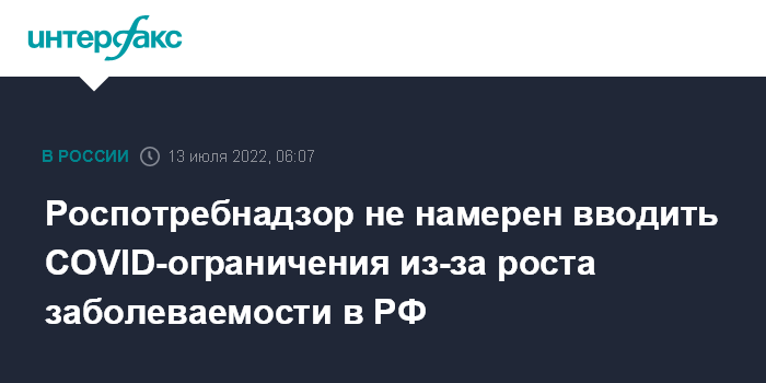 Москва. 13 июля. INTERFAX.RU - Введение ограничений в России на фоне роста числа новых случаев COVID-19 не требуется, так как вызванная подвариантами BA.4/BA.5 инфекция протекает легче заболевания, которое провоцируют исходные штаммы коронавируса, "альфа" и "дельта", заявили в Роспотребнадзоре.