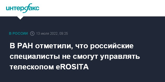9 июля президент РАН Александр Сергеев сообщил "Интерфаксу", что российские специалисты в ближайшее время не будут самостоятельно включать телескоп eROSITA.