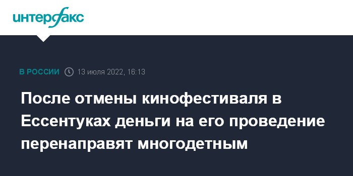 Москва. 13 июля. INTERFAX.RU - Деньги, которые выделили на проведение перенесенного на 2023 год кинофестиваля "Хрустальный источникЪ" в Ессентуках, направят на поддержку многодетных семей, сообщил глава города Александр Некристов.