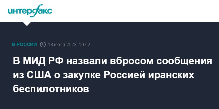 Москва. 13 июля. INTERFAX.RU - В Москве рассматривают заявления Вашингтона о закупке Россией иранских ударных беспилотников как целенаправленный вброс, приуроченный к ближневосточному турне президента США Джозефа Байдена, заявил в среду источник в МИД России.