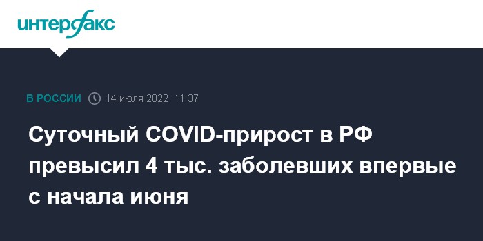 Москва. 14 июля. INTERFAX.RU - Суточный прирост новых заболевших коронавирусной инфекцией в РФ составил более 4,2 тыс. случаев, госпитализированы почти 1,3 тыс. человек, скончались 43 пациента с COVID-19, следует из данных оперативного штаба, обнародованных в четверг; впервые с начала июня в России за сутки выявили более 4 тысяч инфицированных.