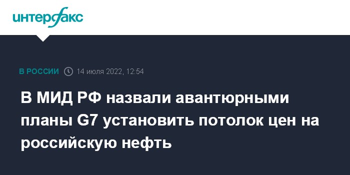 Москва. 14 июля. INTERFAX.RU - Реализация планов "Группы семи" по установлению потолка цен на российскую нефть приведет к удорожанию этого энергоресурса, заявила официальный представитель МИД РФ Мария Захарова.