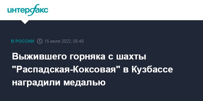Москва. 15 июля. INTERFAX.RU - Шахтер Леонид Моисеев, который считался пропавшим после обвала 5 июля горной выработки на шахте "Распадская-Коксовая" (Междуреченск, Кемеровская область) награжден медалью "За честь и мужество", кроме того, награды получили и сотрудники ВГСО (военизированного горноспасательного отряда), сообщает губернатор Кузбасса Сергей Цивилев в своем телеграмм-канале в пятницу.
