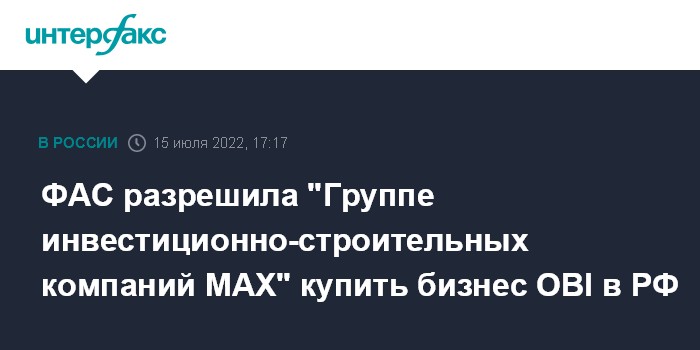 Москва. 15 июля. INTERFAX.RU - ФАС согласовала ходатайство "Группы инвестиционно-строительных компаний MAX" о приобретении российского бизнеса OBI, сообщается в пресс-релизе антимонопольного ведомства.