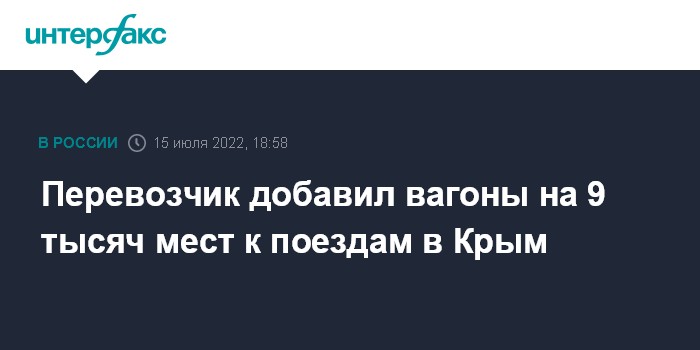 Москва. 15 июля. INTERFAX.RU - Транспортная компания "Гранд Сервис Экспресс" (ГСЭ, Москва) объявила о начале продаж около 9 тысяч дополнительных мест на поезда с материковой части РФ (из Смоленска, Астрахани и Кисловодска) в Крым и обратно, сообщил ж/д перевозчик в своем телеграм-канале.