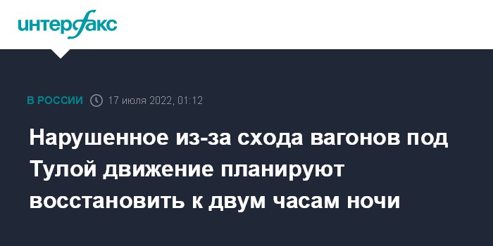 Нарушенное из-за схода вагонов под Тулой движение планируют восстановить к двум часам ночи