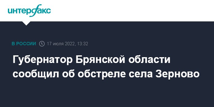 Москва. 17 июля. INTERFAX.RU - Губернатор Брянской области Александр Богомаз сообщил об обстреле села Зерново Суземского района.