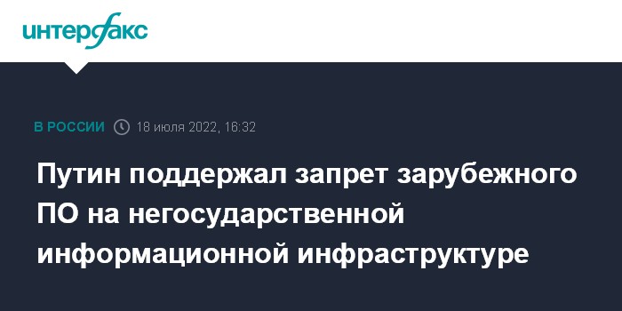 Москва. 18 июля. INTERFAX.RU - Президент Владимир Путин поддержал инициативу правительства запретить использование зарубежного программного обеспечения на любых объектах критической информационной инфраструктуры (КИИ), включая негосударственные.