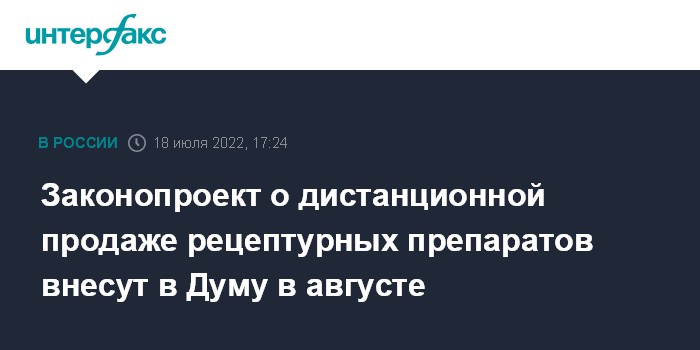 Москва. 18 июля. INTERFAX.RU - Законопроект о дистанционной торговле рецептурными лекарственными препаратами уже подготовлен, в августе его могут внести в Госдуму, сообщила на заседании совета по стратегическому развитию и нацпроектам вице-премьер Татьяна Голикова.