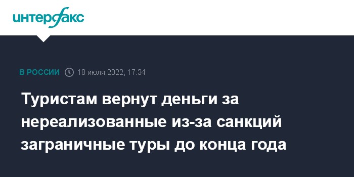 Москва. 18 июля. INTERFAX.RU - Российским туристам, купившим путевки за рубеж в этом году, но не сумевшим отправится в путешествие из-за санкций на авиаотрасль, вернут деньги или предложат заменить на поездку внутри страны до конца 2022 года, сообщил в понедельник зампред правительства РФ Дмитрий Чернышенко.