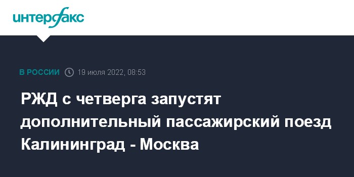 Москва. 19 июля. INTERFAX.RU - ОАО "РЖД" увеличивает количество поездов в сообщении с Калининградом, сообщила компания.