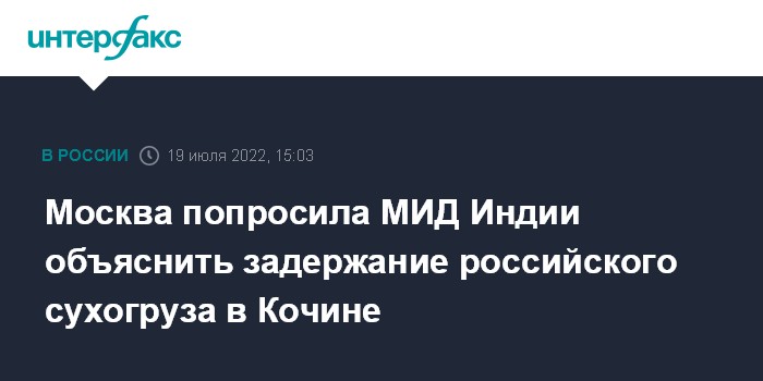 Москва. 19 июля. INTERFAX.RU - Посольство России в Индии попросило МИД страны объяснить обстоятельства задержания в южноиндийском порту Кочин российского сухогруза, сообщили "Интерфаксу" в дипмиссии. По словам дипломатов, задержанное судно везло индийским военным груз военного назначения.