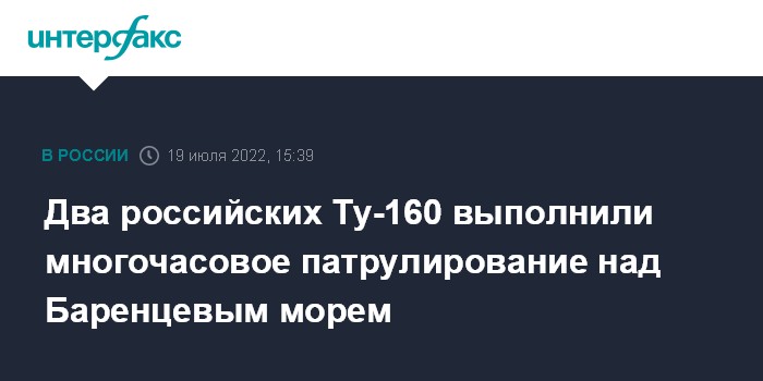 Москва. 19 июля. INTERFAX.RU - Минобороны России заявило, что два стратегических ракетоносца Ту-160 выполнили плановый полет над нейтральными водами Баренцева моря.