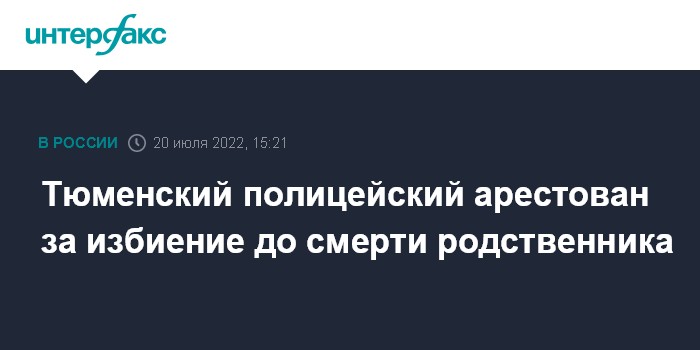 Москва. 20 июля. INTERFAX.RU - Суд в Тюмени заключил под стражу полицейского, обвиняемого в избиении до смерти своего родственника, сообщили "Интерфаксу" в среду в объединенной пресс-службе судебной системы региона.