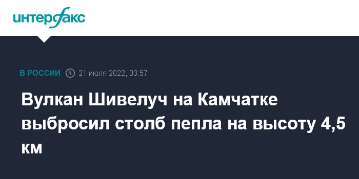 Москва. 21 июля. INTERFAX.RU - Вулкан Шивелуч на Камчатке в четверг утром выбросил столб пепла на высоту до 4,5 км над уровнем моря, сообщает ГУ МЧС региона со ссылкой на Камчатскую группу реагирования на вулканические извержения (KVERT) Института вулканологии и сейсмологии Дальневосточного отделения Российской академии наук (ДВО РАН).