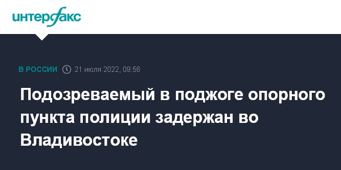 Москва. 21 июля. INTERFAX.RU - Сотрудники правоохранительных органов задержали жителя Владивостока, который подозревается в поджоге опорного пункта полиции. Об этом сообщила в четверг пресс-служба УМВД по городу.