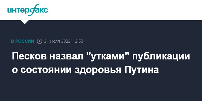 Москва. 21 июля. INTERFAX.RU - У президента Владимира Путина все нормально со здоровьем, заверил на брифинге его пресс-секретарь Дмитрий Песков и назвал публикации в СМИ на эту тему "утками".