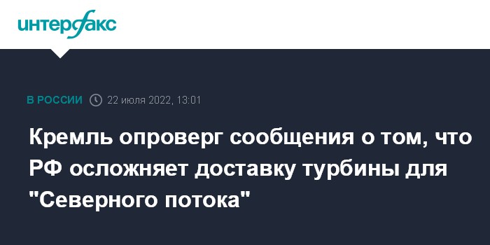 Москва. 22 июля. INTERFAX.RU - В Кремле назвали абсурдной информацию СМИ о том, что проблемы с задержкой доставки турбины для газопровода "Северный поток" исходят от России.