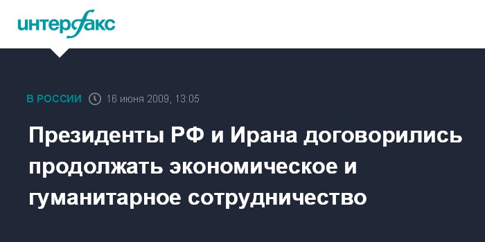Москва. 16 июня. INTERFAX.RU - Встреча президента России Дмитрия Медведева с президентом Ирана Махмудом Ахмадинежадом состоялась на полях саммита ШОС в Екатеринбурге, сообщила пресс-секретарь главы российского государства Наталья Тимакова. Стороны договорились о продолжении экономического и гуманитарного сотрудничества, продолжении контактов.