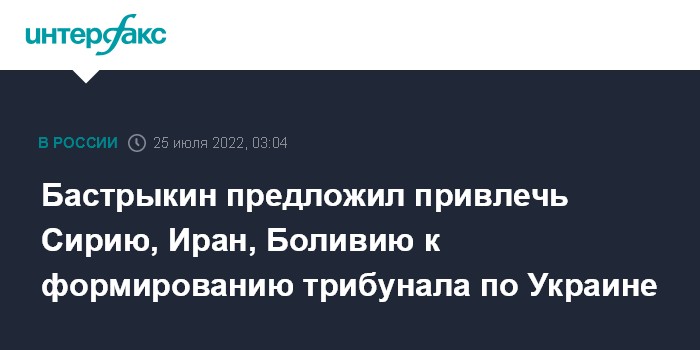 "К работе по формированию международного органа правосудия также целесообразно привлечь и другие страны, демонстрирующие независимую позицию по украинскому вопросу, основывающуюся на нормах международного права, в частности, Сирию, Иран и Боливию", - сказал Бастрыкин в интервью "Российской газете".